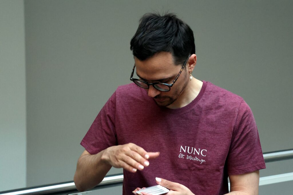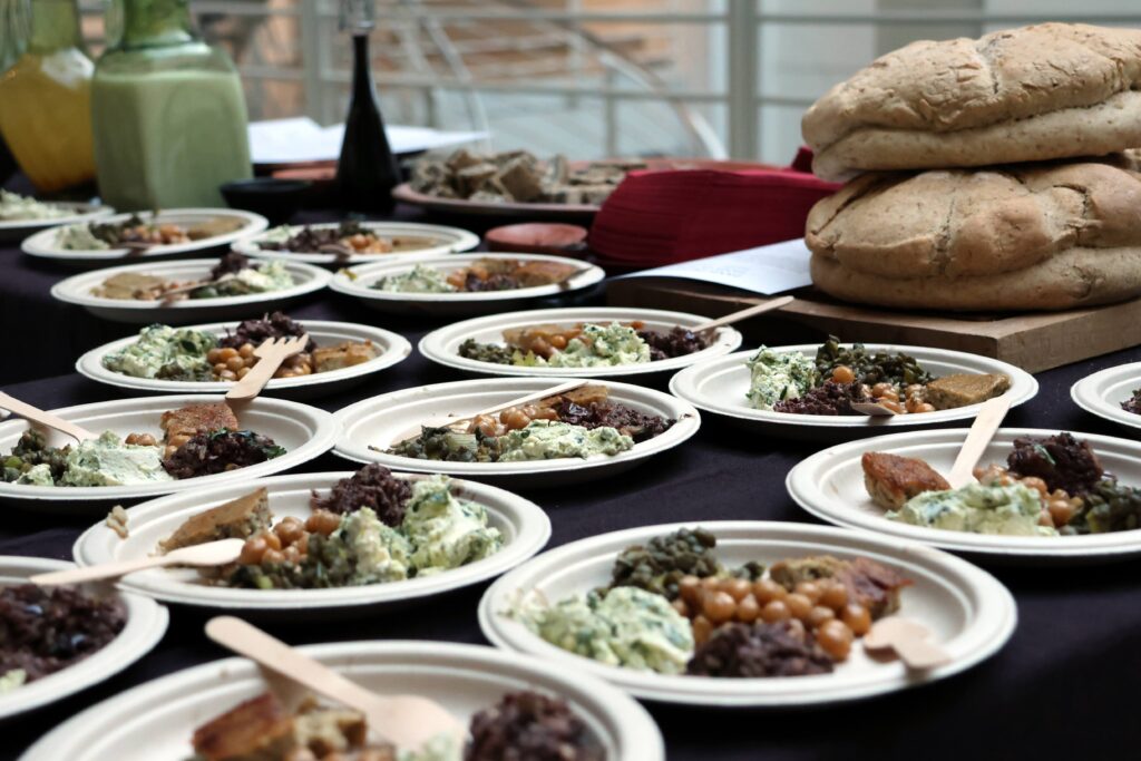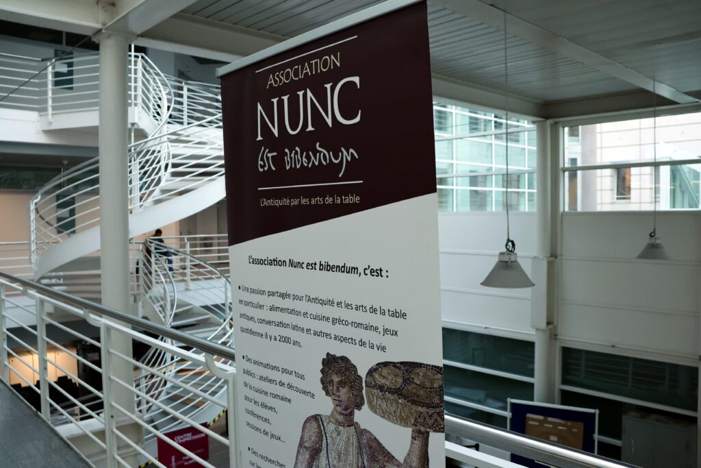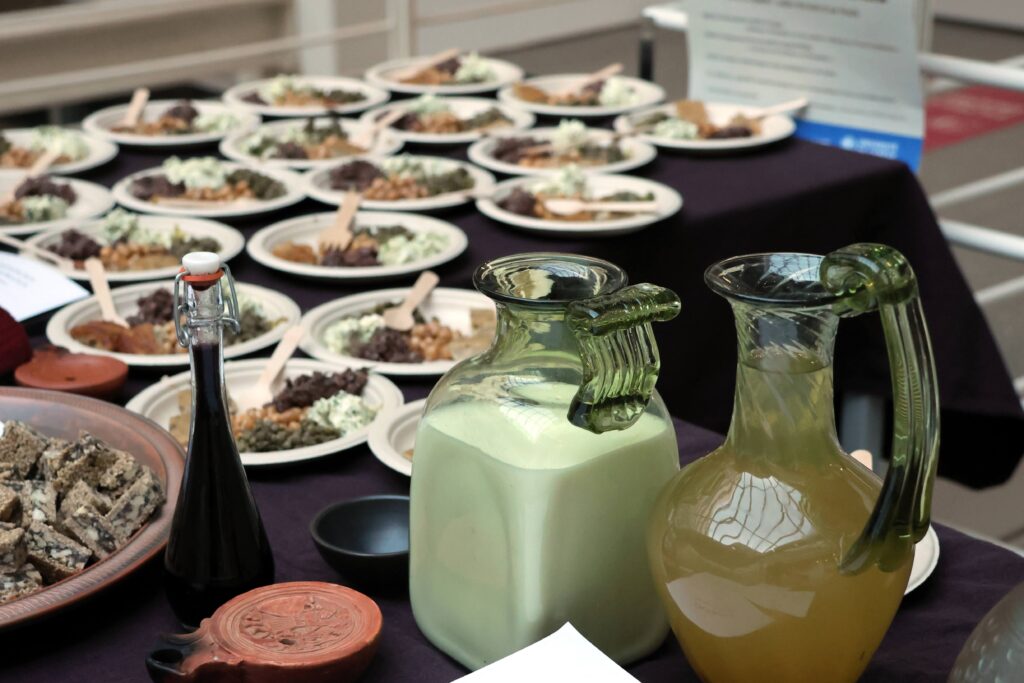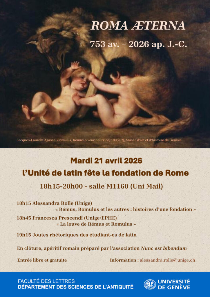 Pour la première édition de Roma Æterna, l’Unité de latin de l’Université de Genève a réuni le 21 avril 2026 près de quatre-vingts personnes à Uni-Mail pour célébrer la fondation de Rome. Après des conférences des professeures Alessandra Rolle et Francesca Prescendi sur les mythes fondateurs, et les joutes rhétoriques des étudiant-es de latin, la soirée s’est conclue autour d’une dégustation romaine. Au menu: pain romain, moretum, epityrum, cicerona, lenticula ex porris; en douceur: patina de piris et gastris, un gâteau crétois au cœur de graines noires; pour se désaltérer: posca et mulsum, sans oublier un mélange de lait et de sapa pour honorer les Parilia, fête de la purification des troupeaux que les Romains célébraient ce même 21 avril.