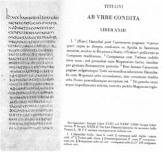 À titre d’illustration, examinons pour terminer le travail de l’éditeur du texte de Tite-Live : il a pour tâche de consulter tous les manuscrits de l’auteur qui sont parvenus jusqu’à nous afin d’établir le texte qu’il estime le plus juste. Voici un manuscrit de Tite-Live (l. XXIII) du Ve siècle (planche XI), conservé à la BNF sous la cote MS. lat. 5730 (fol. 77v), et voici, en regard, le texte édité aux Belles Lettres (2003).