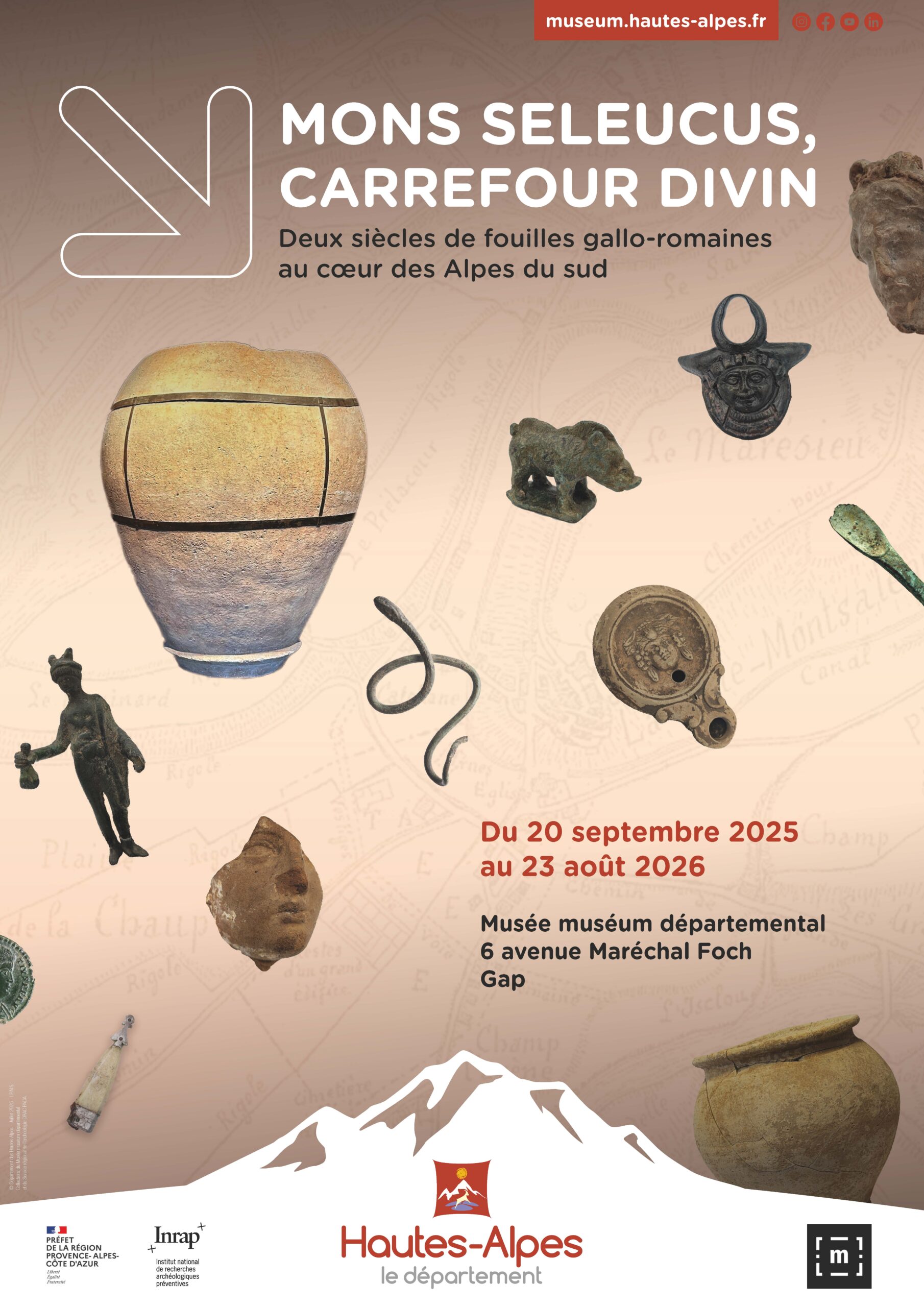 Mons Seleucus, vous connaissez ? C’est le nom du site gallo-romain situé à la Bâtie-Montsaléon, au sud du département haut-alpin qui, entre le 1er et le 5e siècle de notre ère, vit se développer une agglomération installée au carrefour des voies de circulation antiques dotée de bâtiments civils et d’une vaste aire sacrée accueillant plusieurs sanctuaires. L’engouement pour Mons Seleucus remonte au tournant du 19e siècle et nombreux furent les érudits locaux à mener des prospections archéologiques. Des premières campagnes aux fouilles les plus récentes de 2010 et 2021 qui ont mis au jour des vestiges sacrés exceptionnels, explorez l’histoire de ce site et découvrez toutes ses facettes : de la vie quotidienne au temps des gallo-romains jusqu’à leurs pratiques rituelles et religieuses.