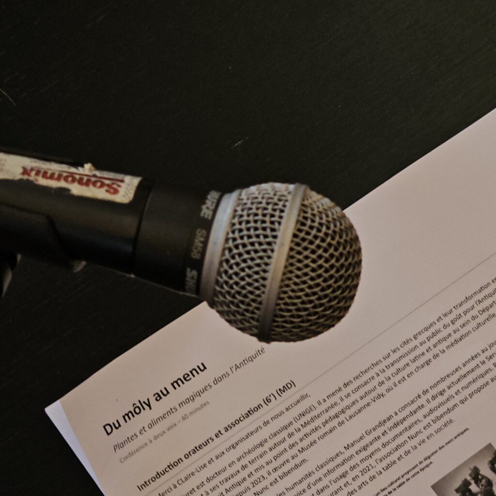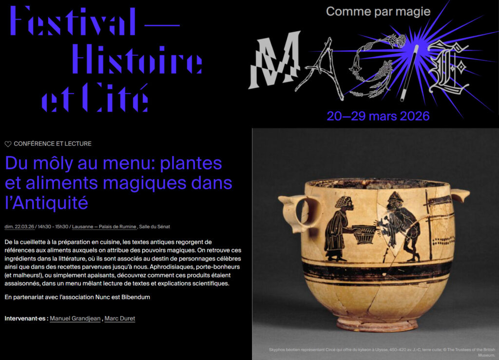 Du môly au menu: plantes et aliments magiques dans l’Antiquité, tel était le titre de la conférence donnée par Manuel Grandjean et Marc Duret dimanche 22 mars 2026 au Palais de Rumine à Lausanne, dans le cadre de l’édition 2026 du festival Histoire et Cité.
