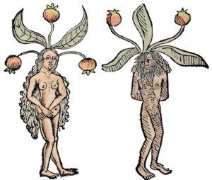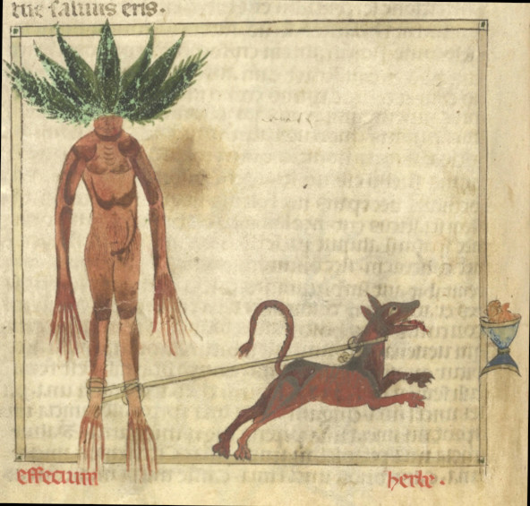 [14] Herbarius Apulei (Pseudo-Apulée), herbier latin illustré du 4e siècle, abondamment recopié et diffusé jusqu’au 16e siècle. C’est le premier texte à associer explicitement le cri de la mandragore à une mort certaine pour qui l’entend. Le motif se développe et se précise à partir du 9e siècle dans la littérature médicale médiévale.