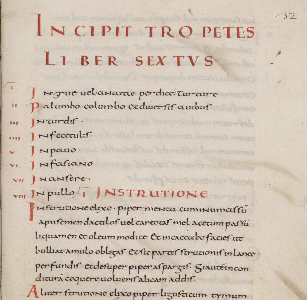 De ce modèle dérivent toutefois deux témoins carolingiens du 9e siècle conservés jusqu’à aujourd’hui: l’un est à la bibliothèque du Vatican (Urb.lat.1146[12]) et l’autre à l’Académie de médecine de New-York (manuscrit de Cheltenham/New York[13]). Leur comparaison révèle un texte stable dans son ensemble mais fragile dans ses détails, marqué par l’hésitation des scribes devant un lexique culinaire souvent obscur. Certaines anomalies, que l’on pourrait croire antiques, sont peut-être des rationalisations médiévales.