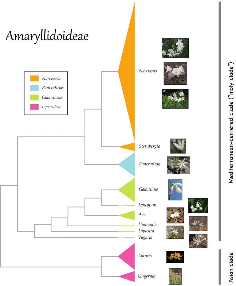 En 1983, Plaitakis et Duvoisin avaient proposé d’identifier le môly au perce-neige (Galanthus nivalis), dont les bulbes contiennent de la galanthamine, capable en théorie de contrer une intoxication par les plantes de Circé – mandragore, jusquiame. En 2024, Molina-Venegas et Verano ont élargi cette hypothèse: plutôt qu’une espèce unique, le môly désignerait un complexe ethnobotanique, c’est-à-dire plusieurs espèces méditerranéennes apparentées, partageant fleurs blanches, bulbes à tuniques foncées, et alcaloïdes inhibiteurs de l’acétylcholinestérase – des substances capables de contrer une intoxication aux plantes narcotiques.[14] Parmi elles, les lis maritimes (Pancratium spp.) sont abondants en Méditerranée et déjà représentés dans l’art minoen et mycénien. Leurs racines contractiles enfoncent le bulbe jusqu’à 160 cm dans le sol, ce qui pourrait expliquer concrètement la difficulté d’arrachage que décrit Homère. D’ailleurs, la nivéole d’été repérée par Amigues appartient précisément à ce groupe.